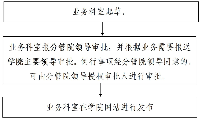 业务通知内容包括工作安排通知、 业务公告、 办事指南等, 主要通过学院官方网站发布。 流程为: