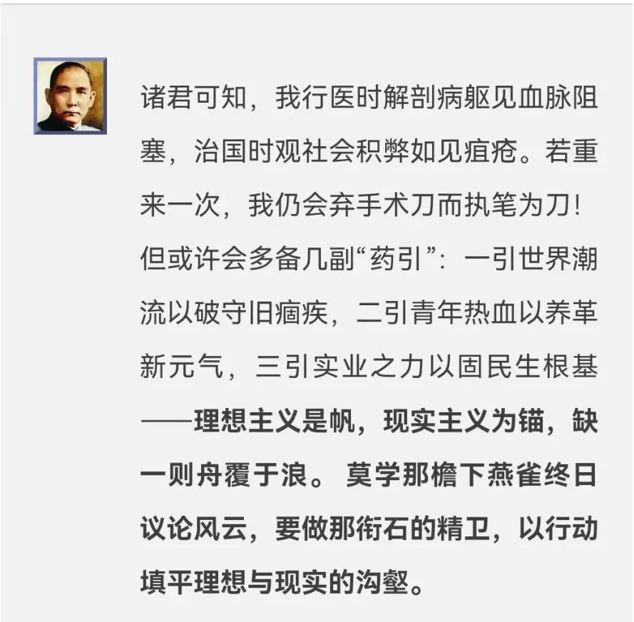斯人已逝,风骨长存,这位曾以“逸仙”之名行医救人的革命先驱,用一生来诠释“救人救国救世,医病医身医心”。今日的我辈学子白袍之下,跳动着与百年前同样赤诚的初心——悬壶济世的热忱从未褪色,探索真理的勇气历久弥坚。