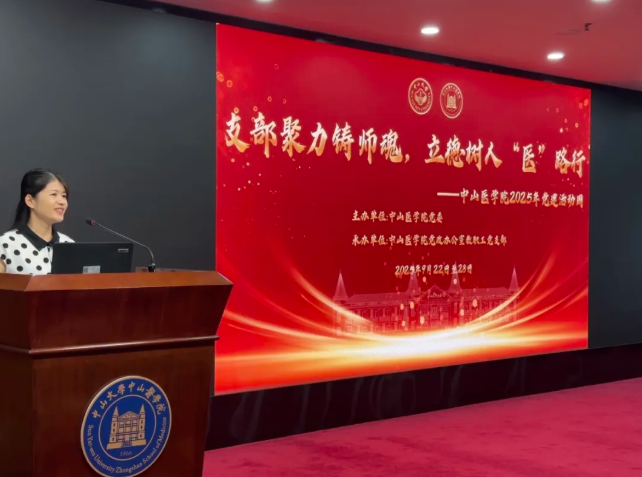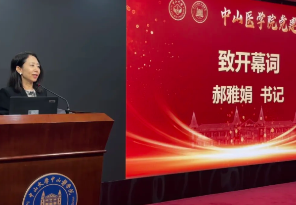 中山医学院党委书记郝雅娟为开幕式致辞,她表示本届党建活动周以“师德师风”建设为核心,旨在推动党建与业务深度融合,杜绝“两张皮”。同时在总结首届党建活动周成功经验的基础上呼吁各党支部加强联动与合作,努力打造具有学科辨识度和影响力的院级、乃至校级党建品牌,以高质量党建引领学院高质量发展,为培养卓越医学人才凝聚强大合力。
