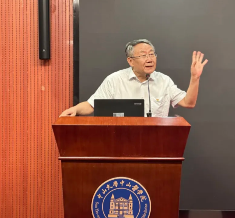 中山医学院原副院长刘先国教授作为光荣在党50年的党员代表发言。他深情回顾了以柯麟老院长和“八大教授”为代表的中山医人红色传统与奉献精神,强调在新时代传承红色基因、勇担使命的迫切性。他呼吁全体师生积极响应国家战略需求,立足医学本职、锐意进取,不断攀登医学高峰,为实现中华民族伟大复兴贡献中山医人的智慧与力量。