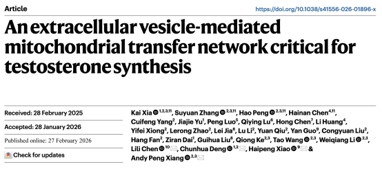 2026年2月27日,永利yl23411中山医学院项鹏教授团队,联合附属第一医院肖海鹏教授、邓春华教授、附属口腔医院陈莉莉教授团队,在国际权威期刊《Nature Cell Biology》发表了一项研究,首次揭开了这个谜底。他们发现,睾丸内存在一个由细胞外囊泡介导的、精妙的 “双向线粒体转移网络”。
