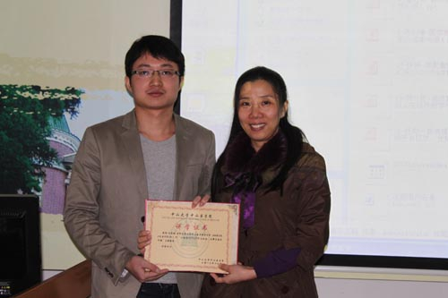 周俊宜主任正在给段妍老师颁讲学证书