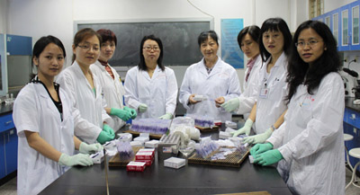 病原生物学实验室的全体人员迅速投入了制片工作,大家分工合作:有的擦玻片、有的配缓冲液和染液、有的制作涂片、有的固定血膜,一直忙到晚上近11点钟,才把阳性标本处理好;随后的几天大家又利用工作间隙与休息时间,进行染色、保存,顺利完成所有实验流程。