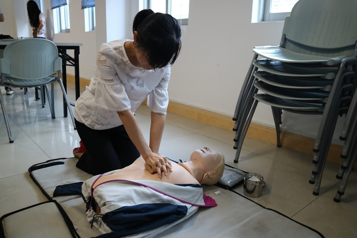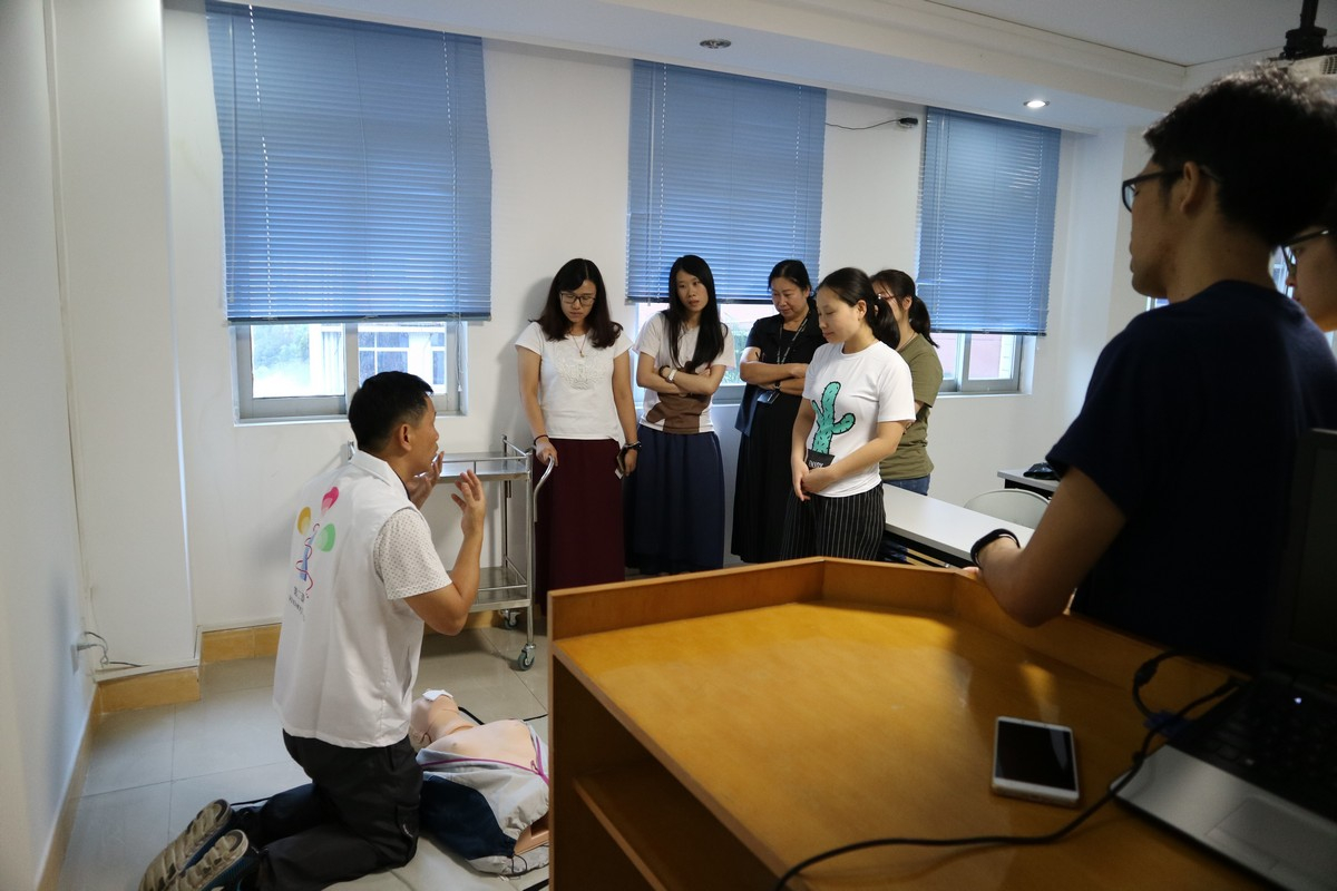 具有市红十字会应急救护培训师资格的徐达政老师在急救培训方面有相当丰富的经验,以其幽默风趣的讲课风格把严肃的急救课变成了一场有趣深刻的交流课。徐老师首先给我们讲解了心肺复苏的适用场景以及理论知识,然后亲自演示了心肺复苏操作的全部步骤,最后每一位学生还在心肺复苏的人体模型进行了模拟抢救,大家都非常认真学习以及操作练习。