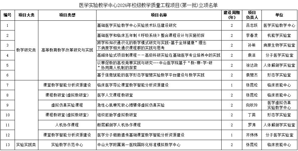 一直以来,医学实验教学中心始终秉承中山医 “三基三严三早”的优良教育传统,认真落实学校立德树人的根本任务。本次13项项目成功立项,既是对中心过往教学改革成果的充分肯定,也为后续培育更高层次教学成果奠定了坚实基础。中心将以此次立项为新起点,扎实推进各项项目落地见效,不断提升教学质量与教学改革水平。