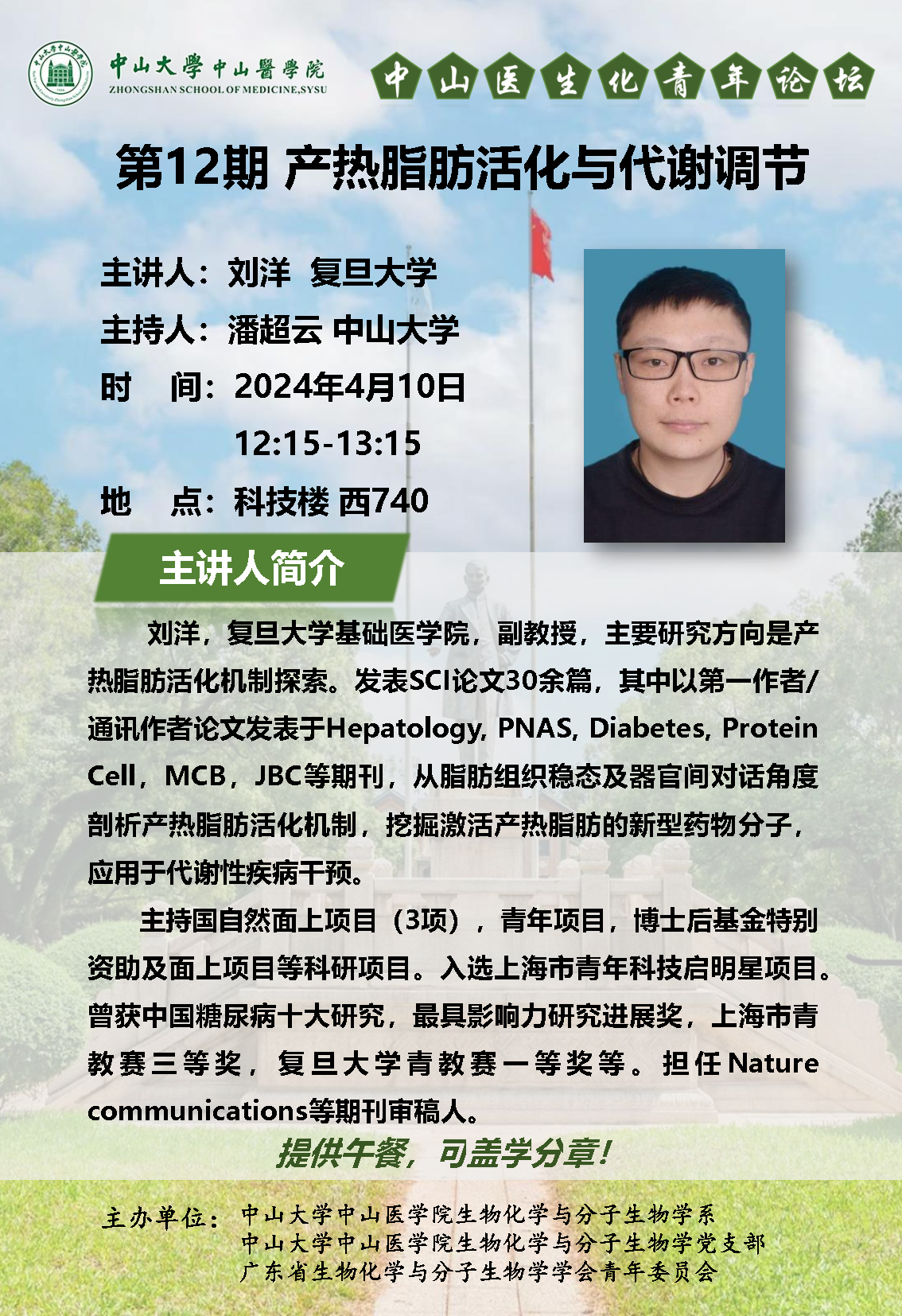 导航痕迹 首页 科学研究 学术讲座 中山医生化青年论坛第12期 科学研究 科研通知 学术讲座 科研平台 办理指引 中山医生化青年论坛第12期 产热脂肪活化与代谢调节 发布人:管理员 发布日期:2024-04-09 活动时间2024年04月10日 12:15 - 2024年04月10日 13:10