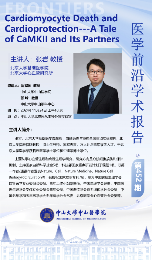 导航痕迹 首页 科学研究 学术讲座 医学前沿学术报告第452期 科学研究 科研通知 学术讲座 科研平台 办理指引 医学前沿学术报告第452期 Cardiomyocyte Death and Cardioprotection --- A Tale of CaMKll and lts Partners 发布人:何军芳 发布日期:2024-11-19