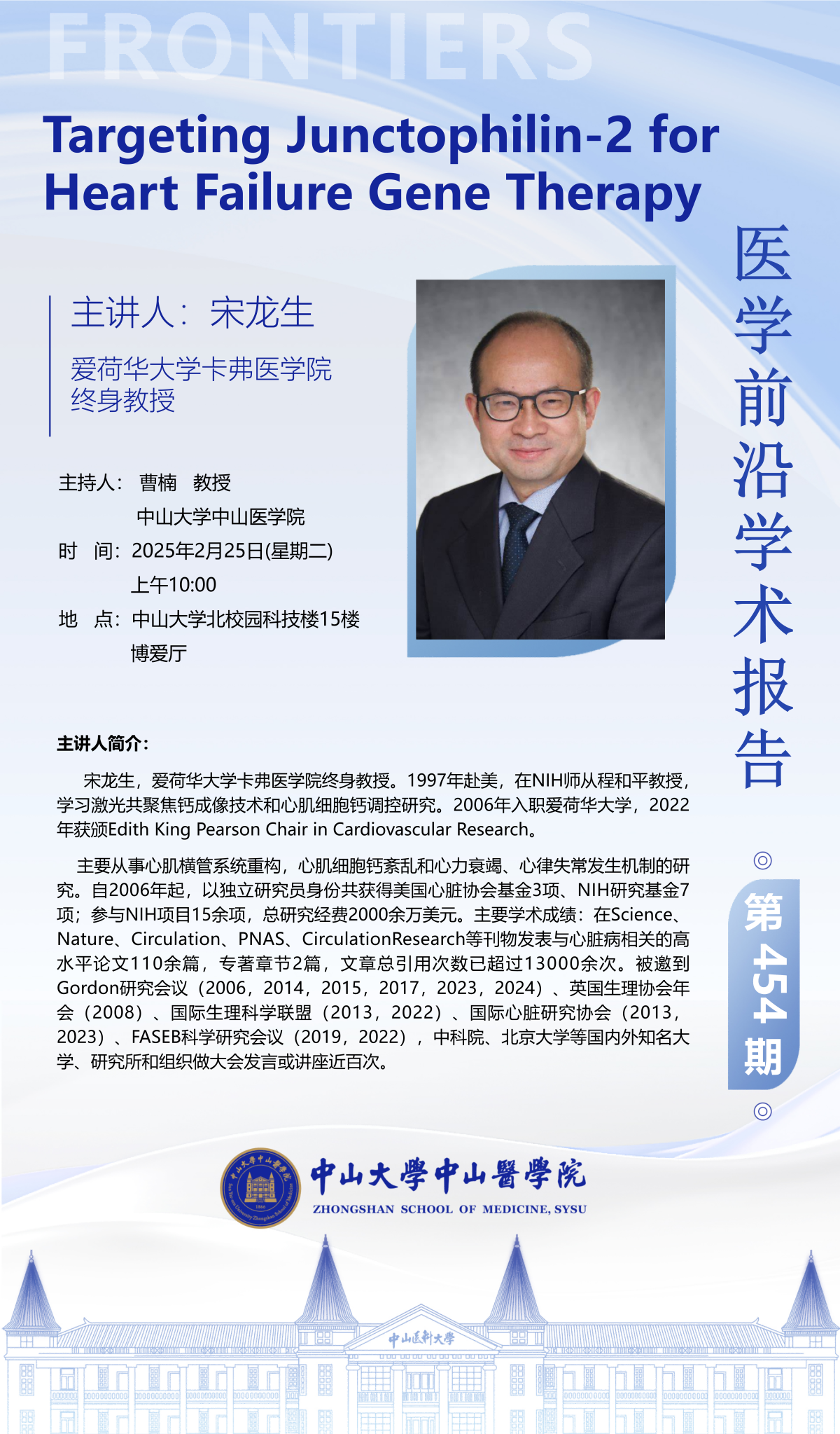 导航痕迹 首页 科学研究 学术讲座 医学前沿学术报告第454期 科学研究 科研通知 学术讲座 科研平台 办理指引 医学前沿学术报告第454期 发布人:何军芳 发布日期:2025-02-22 主题:Targeting Junctophilin-2 for Heart Failure Gene Therapy地点:永利yl23411北校园科技楼15楼博爱厅主讲:宋龙生 爱荷华大学卡弗医学院终身教授