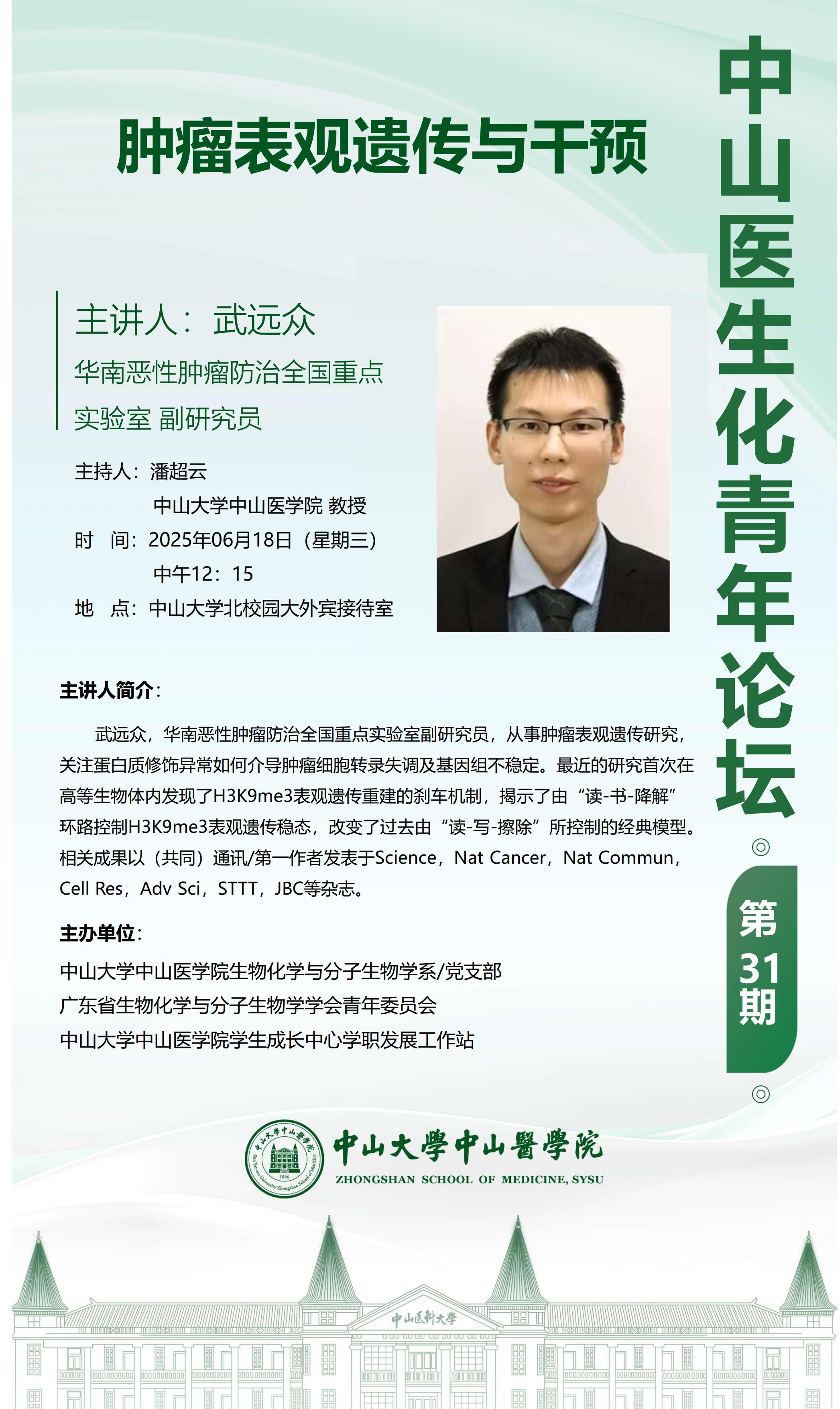 导航痕迹 首页 科学研究 学术讲座 中山医生化青年论坛第31期 科学研究 科研通知 学术讲座 科研平台 办理指引 中山医生化青年论坛第31期 肿瘤表观遗传与干预 发布人:张玉琦 发布日期:2025-06-19