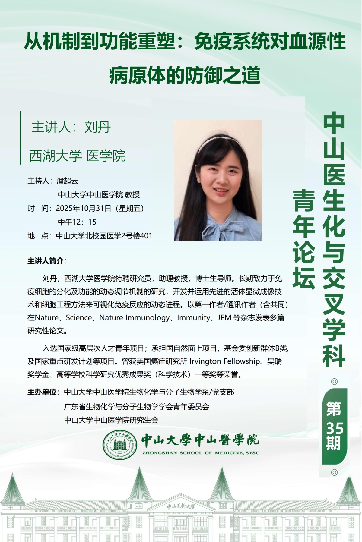 导航痕迹 首页 科学研究 学术讲座 中山医生化与交叉学科青年论坛|从机制到功能重塑:免疫系统对血源性病原体的防御之道 科学研究 科研通知 学术讲座 科研平台 办理指引 中山医生化与交叉学科青年论坛|从机制到功能重塑:免疫系统对血源性病原体的防御之道 从机制到功能重塑 发布人:张玉琦 发布日期:2025-10-27