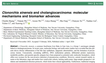 近日,我院2024级基础医学拔尖基地本科生黄琛霖,以第一作者身份在Parasite杂志发表题为《Clonorchis sinensis and cholangiocarcinoma: molecular mechanisms and biomarker advances》的综述文章,系统梳理华支睾吸虫与胆管癌的关联机制及分子标志物研究进展,为相关疾病的早期筛查与精准防控提供重要理论支撑。