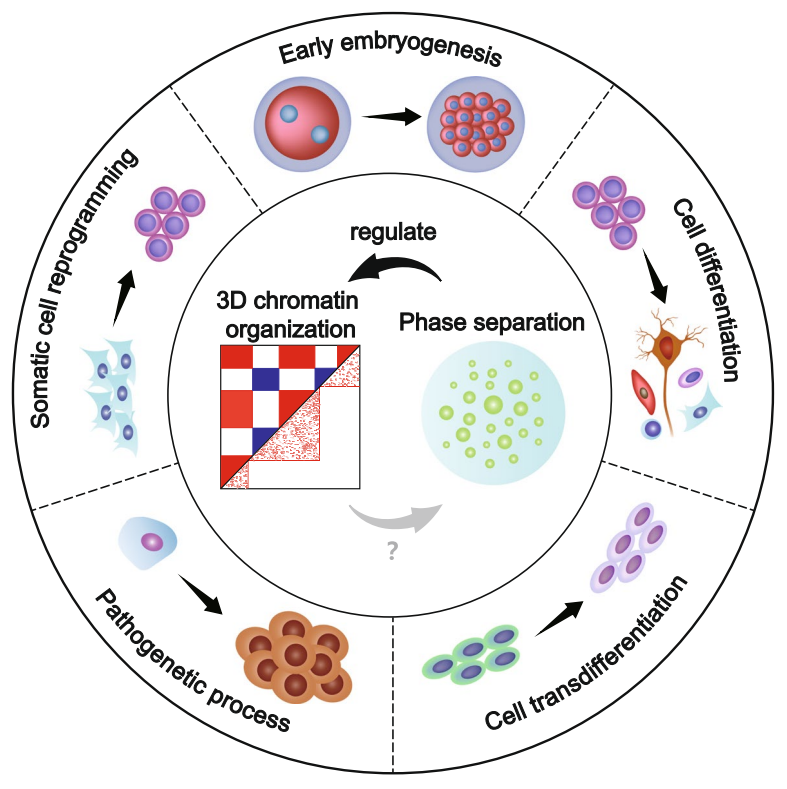 In conclusion, phase separation is one of the most important mechanisms regulating the 3D chromatin organization. Studying the relationship between 3D chromatin organization and phase separation can help us further understand how cell fate is regulated. How they are involved in cell fate regulation can be briefly summarized in the following three models: (1) phase separation affects cell type-specific gene expression to regulate cell fate by regulating 3D chromatin structure at different hierarchies, (2) specific chromatin structure recruits different phase separations, affects cell type-specific gene expression to regulate cell fate, (3) phase separation and 3D chromatin structure affect cell type-specific gene expression to regulate cell fate without interfering with each other. There are still many questions about 3D chromatin structure and phase separation remaining to be solved. It is believed that a more comprehensive and clear mechanism will be demonstrated in the near future.