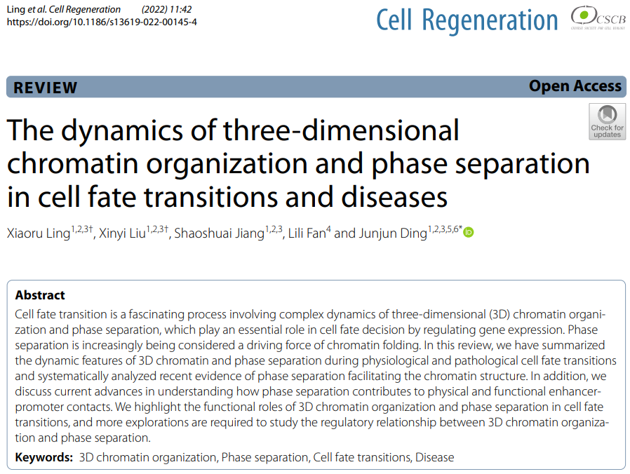 On 21st December 2022, the review of Professor Junjun Ding's team entitled "The dynamics of three-dimensional chromatin organization and phase separation in cell fate transitions and diseases" is published in Cell Regeneration, which systematically reviews the dynamics of 3D chromatin organization and phase separation in various cell fate transitions and diseases, and highlights direct and indirect evidence for the involvement of phase separation in regulating chromatin folding. Based on these, strategies to study the relationship between 3D chromatin organization and phase separation are summarized. Besides, a model of how 3D chromatin organization and phase separation jointly or separately regulate gene expression and further affect cell fate transitions is proposed.